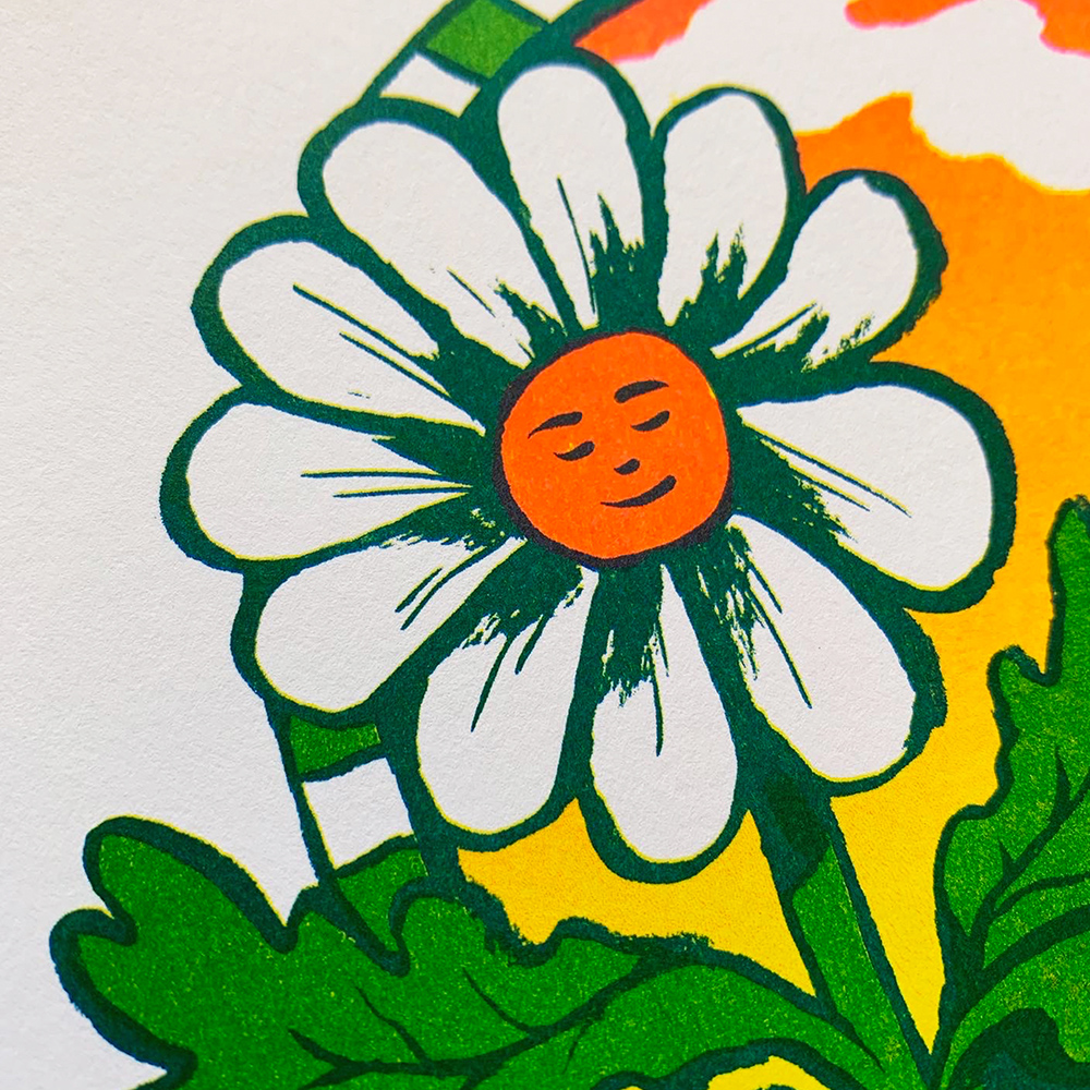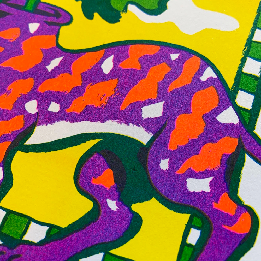 4 color risograph print in blue, yellow, pink, and green. 8.5x11" on Mohawk 80# cover stock.
