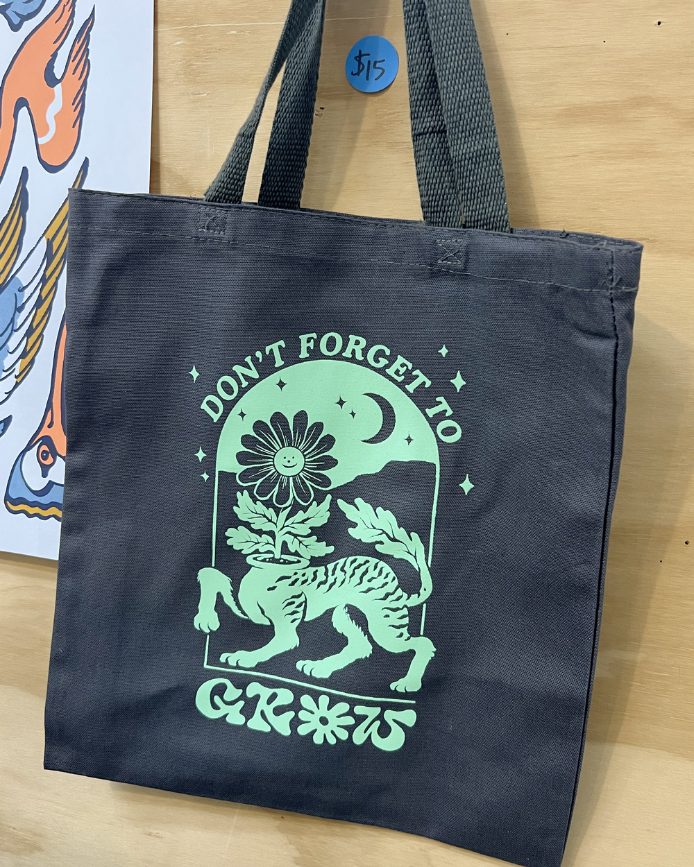 Single color "Don't Forget to Grow" Bloombeast graphic on charcoal tote.